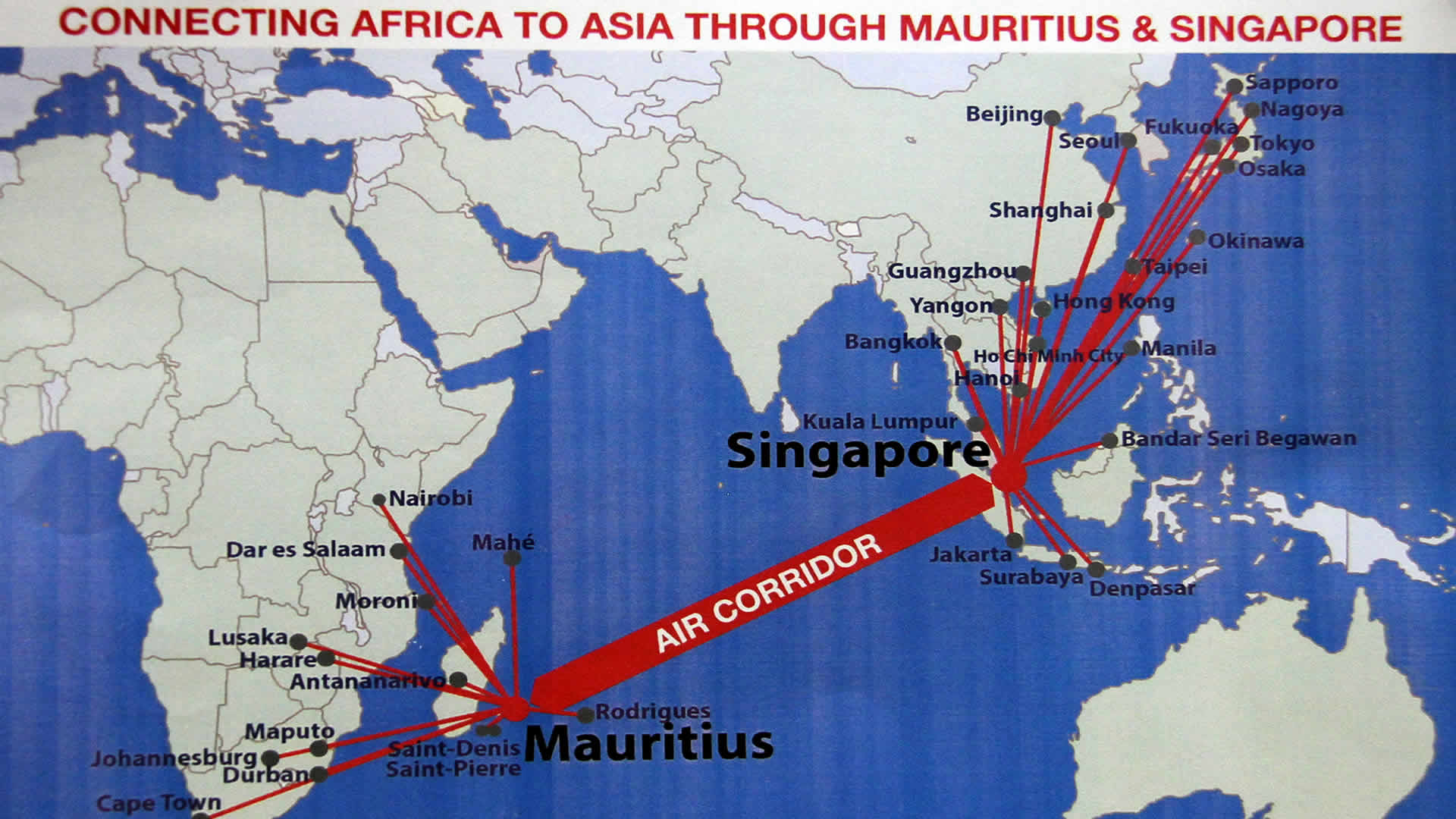 La mise en place d'un corridor aérien entre Maurice et l'aéroport de Changi au Singapour se précise. Une délégation Singapourienne est d'ailleurs actuellement chez nous, ils auront un programme très chargé avec des rencontres avec des hauts cadres du gouvernement, de l'industrie du tourisme et de notre compagnie d'aviation nationale. Hier lors d'un atelier de travail avec les responsables d'Air Mauritius, les deux parties ont surtout paufiné les modalités de ce corridor entre l'Asie et Maurice, avec Maurice et Singapour agissant comme Hub. Le chef de la délégation Singapourienne se montre deja très optimiste par rapport a ce projet, il est d'avis que ce modèle pourrait servir d'exemple a d'autres pays.