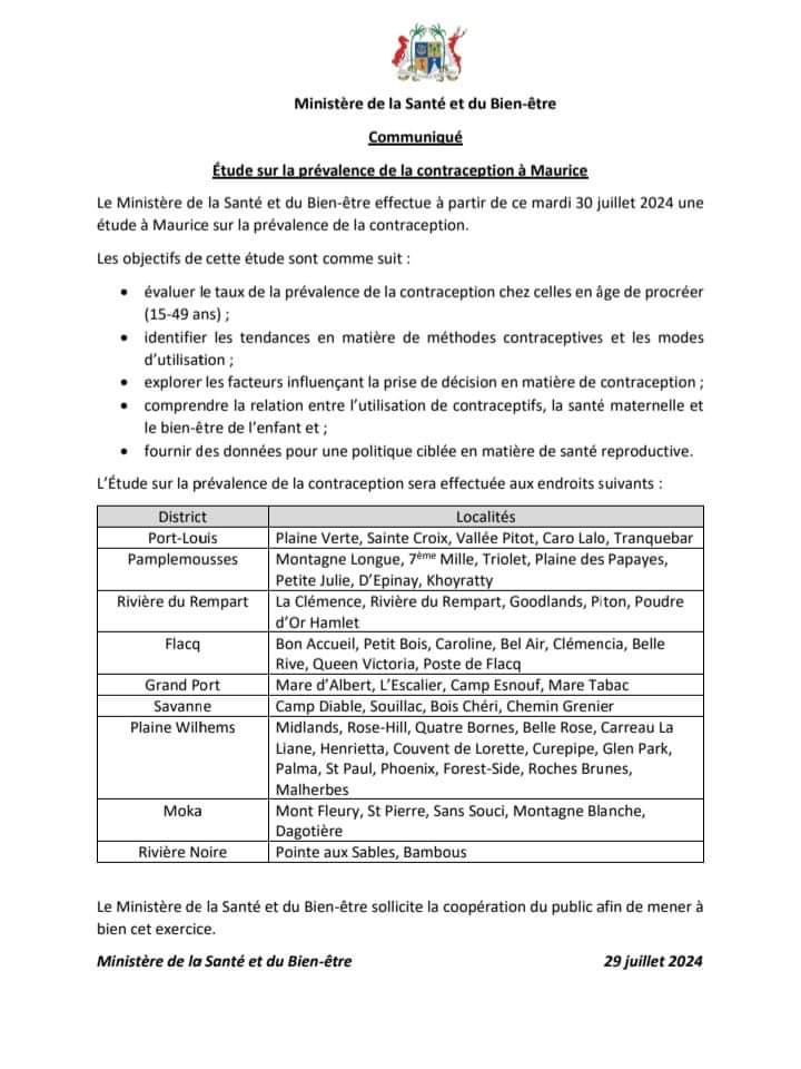 À partir de ce mardi 30 juillet 2024, le ministère de la Santé entame une étude d’envergure nationale sur la prévalence de la contraception à Maurice. Cette initiative vise à collecter des données essentielles sur l'utilisation des méthodes contraceptives parmi les femmes en âge de procréer, soit celles âgées de 15 à 49 ans.