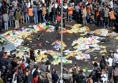 L'attentat, le plus meurtrier jamais commis sur le sol turc, a vraisemblablement été commis par deux kamikazes - les deux explosions ont eu lieu à quelques secondes d'intervalle - lors d'une manifestation pour la paix rassemblant des militants de gauche et des sympathisants prokurdes devant la principale gare ferroviaire de la capitale turque.